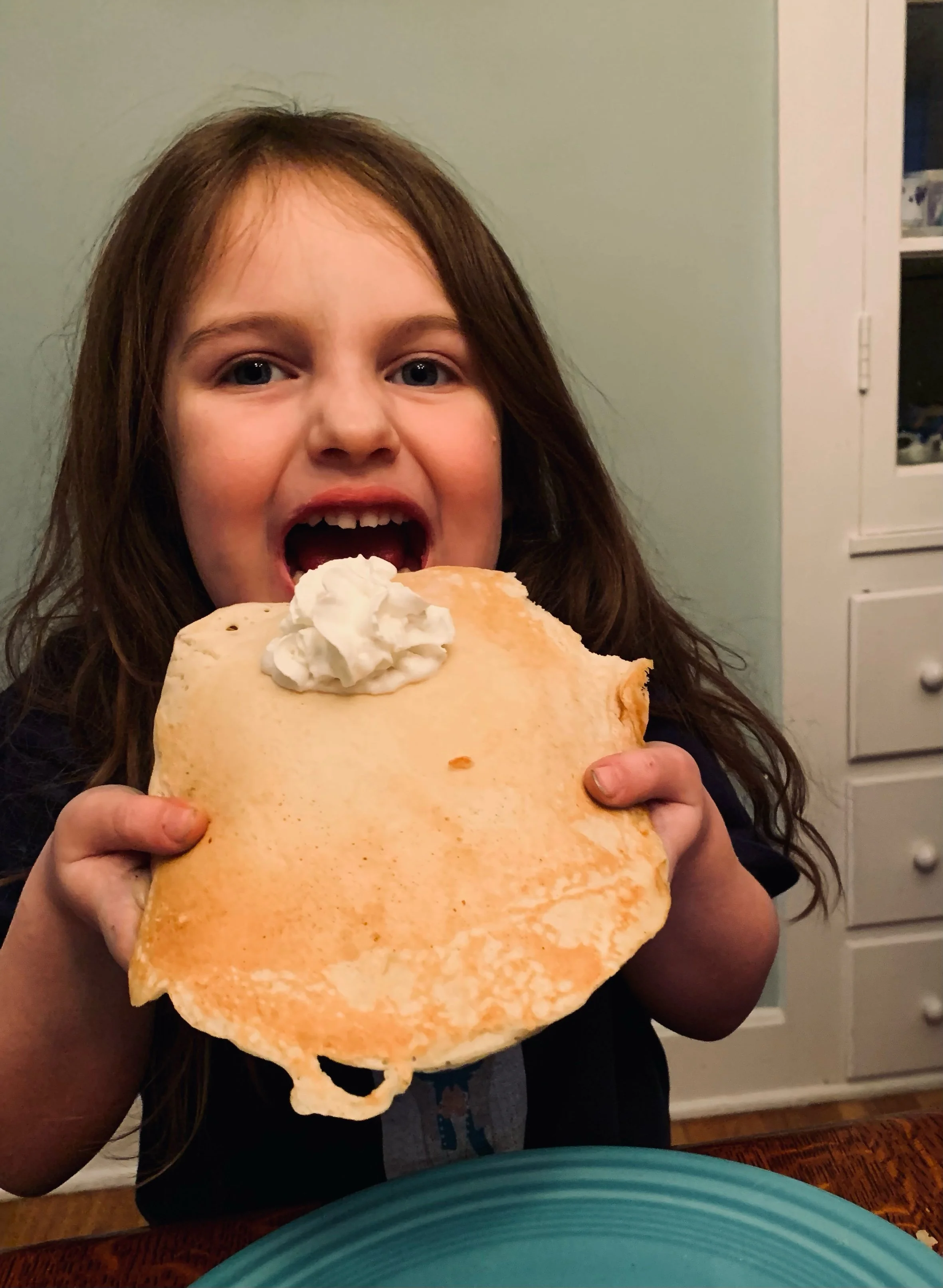 Candlemas is when our family takes down Christmas decorations and stores them away. In our house the Christmas season lasts a very long time! Perhaps to make up for the fact that the rooms in the house are newly dark with the Christmas lights having been taken down, we light our blessed candles and make giant pancakes for dinner every Candlemas. Making pancakes for Candlemas is a French tradition a dear friend once shared with me. Crisp, golden and giant, each pancake resembles the sun. Symbolic of looking ahead to a good harvest, they are also reminiscent of sunshine and the return of warm weather. Each of my kids get their own plate-filling pancake, bigger even than the little ones’ faces. We glow with the happiness of this liturgical dinner feast.